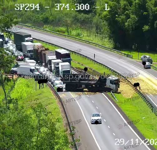 Uma carreta carregada com 36 toneladas de laranja tombou na tarde deste sábado (29) na Rodovia Comandante João Ribeiro de Barros (SP-294), em Duartina (SP). Segundo a Artesp, o acidente ocorreu por volta das 14h, no km 374, após o compartimento lateral do veículo se abrir, por motivos ainda desconhecidos, espalhando a carga pelas pistas.