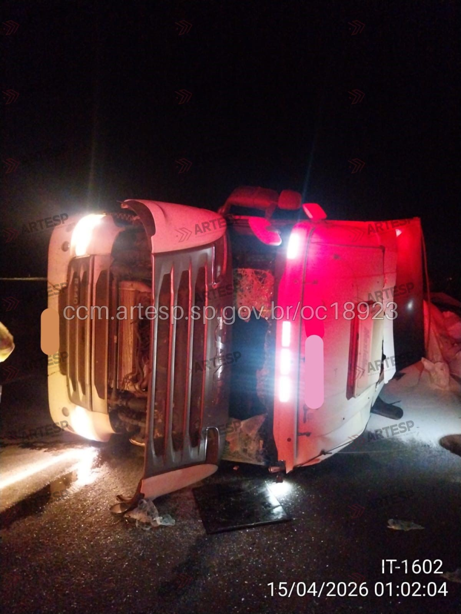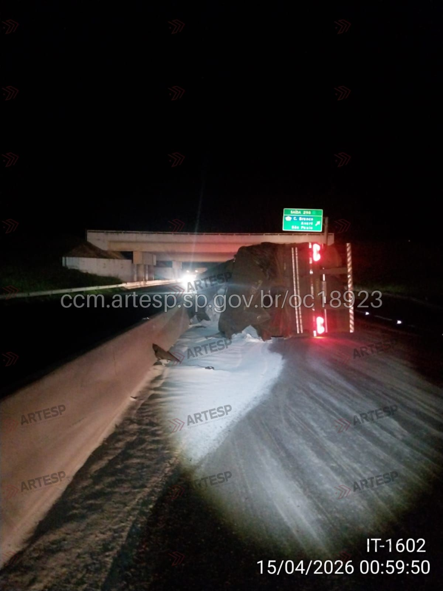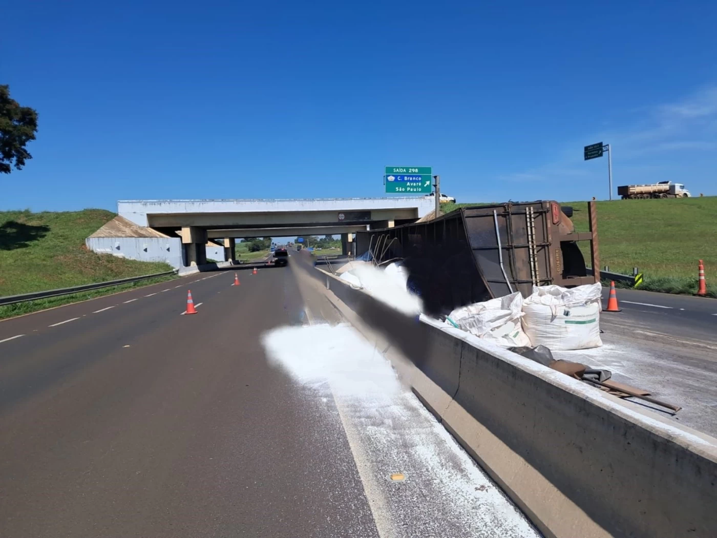 De acordo com informações da Artesp, o condutor de uma carreta Scania 440 seguia no sentido oeste quando, ao entrar no acesso entre rodovias, a carga pendeu para um dos lados, provocando o desequilíbrio do veículo e o tombamento na faixa de rolamento. Parte da carga ficou espalhada pela pista.