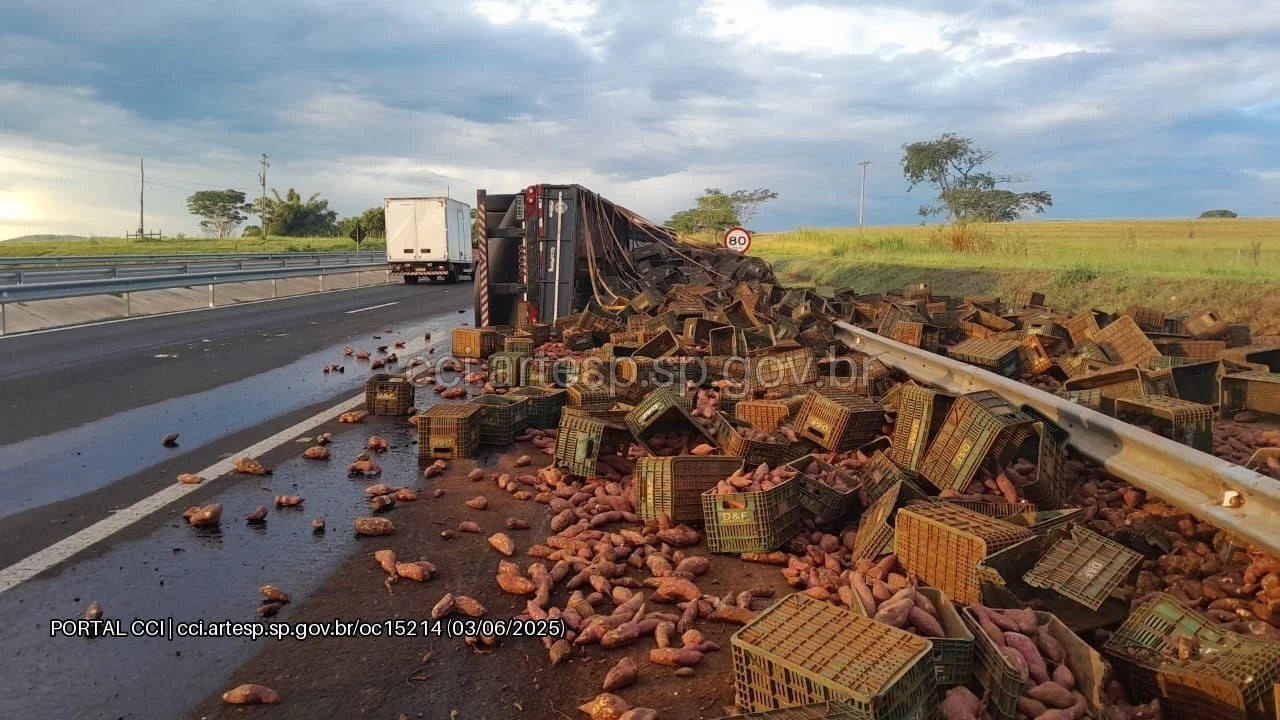 O veículo, uma carreta Volvo FH 500, transportava aproximadamente 30 toneladas de batata-doce quando tombou por motivos que ainda serão apurados. Apesar do susto, o motorista não sofreu ferimentos. A carga se espalhou pelo acostamento e parte da pista, exigindo providências para o transbordo.