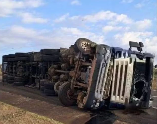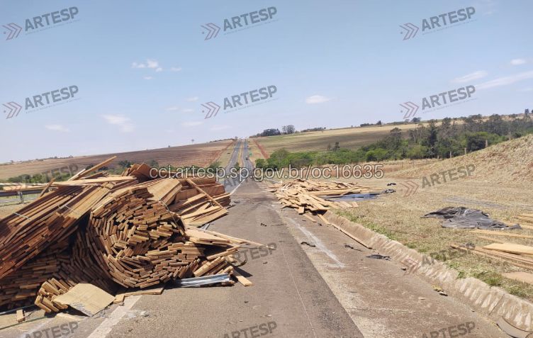 Uma carreta carregada de madeira tombou na manhã desta quinta-feira (25) no km 485 da Rodovia Raposo Tavares (SP-270), em Paraguaçu Paulista (SP).