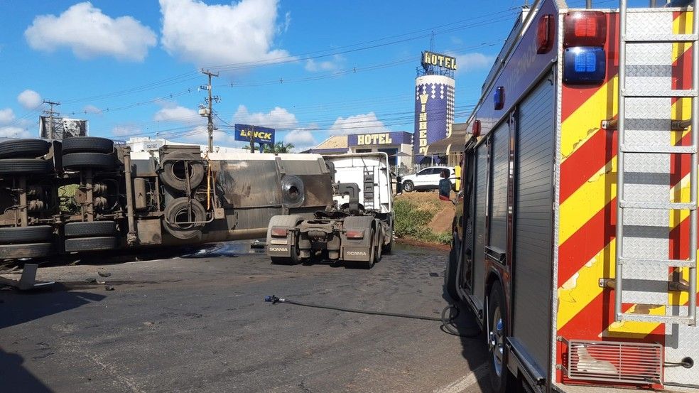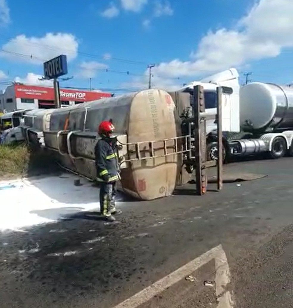 Segundo a PRF, a carreta envolvida no acidente estava realizando uma conversão para fazer o retorno, quando outra carreta carregada com diesel, que vinha logo atrás, não conseguiu frear a tempo e colidiu na lateral do veículo, causando o tombamento. Felizmente, nenhum dos motoristas envolvidos ficou ferido, de acordo com a corporação.