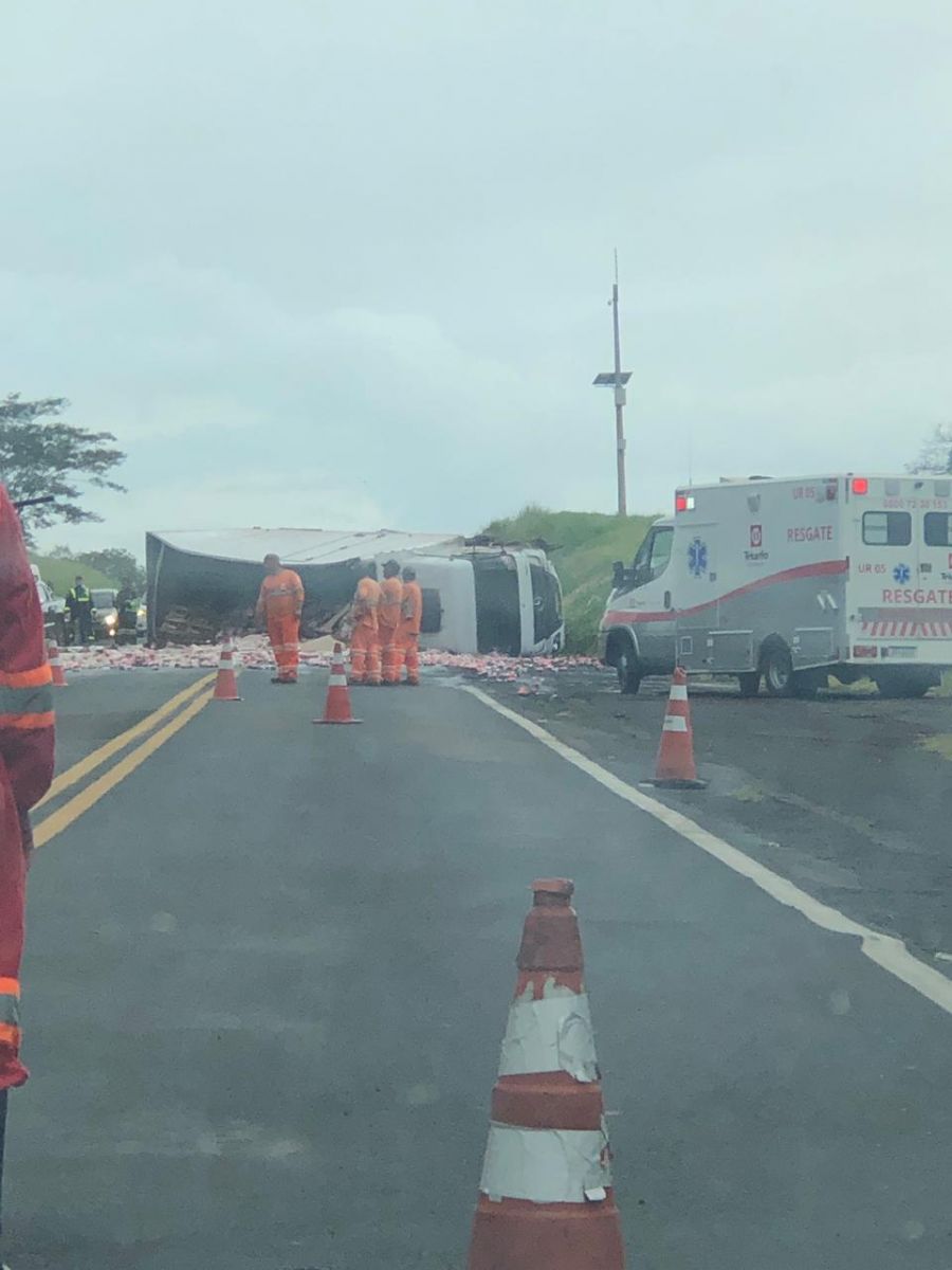 Já 17h22min o caminhão foi destombado, porém, tráfego permanece fluindo no sistema pare/siga, no sentido sul da pista.