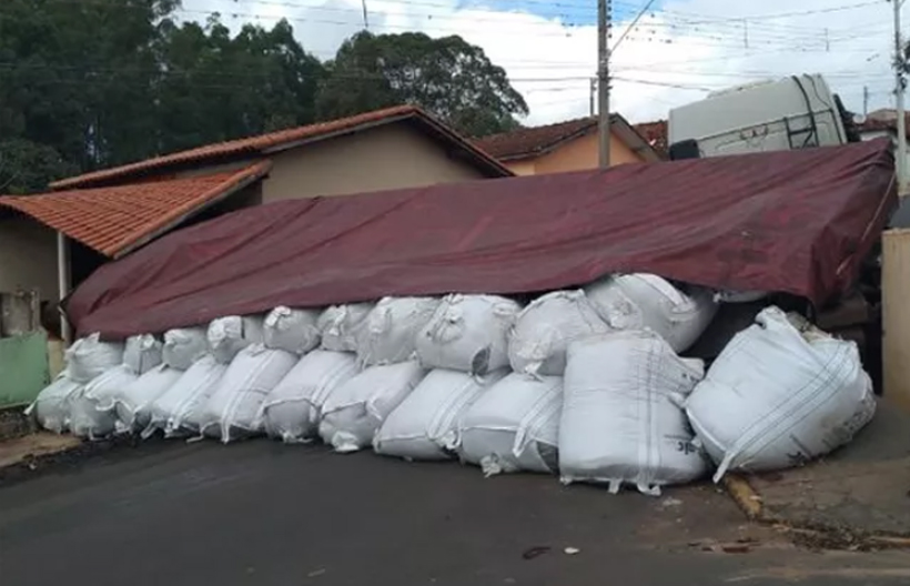 Com o impacto, a carga de adubo tombou na rua, que ainda estava interditada por volta das 17h. Segundo a PM, uma empresa foi acionada para retirar o veículo do local.