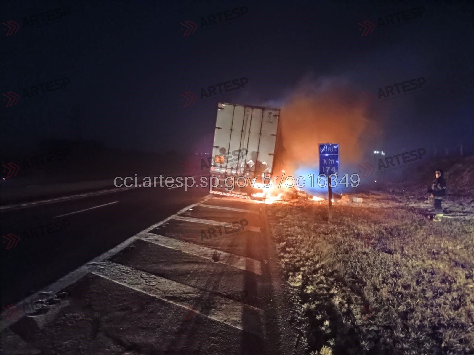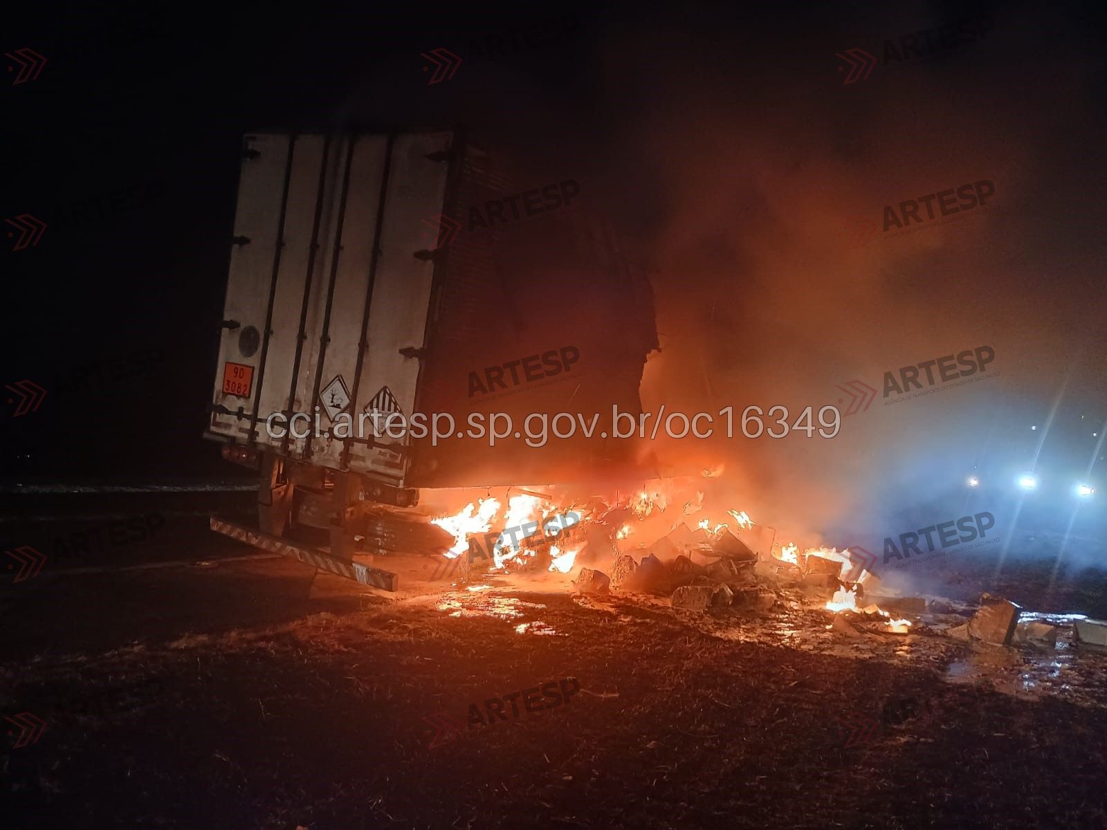 Uma carreta Man TGX 28440, carregada com agrotóxicos, pegou fogo na noite desta sexta-feira (5), por volta das 23h42, no km 174 da Rodovia Anhanguera (SP-330), em Araras (SP).