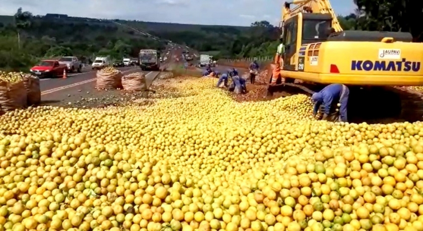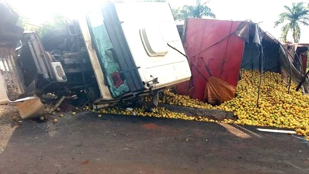 Com o tombamento, as laranjas ficaram espalhadas pela rodovia e, por isso, as duas faixas ficaram interditadas.