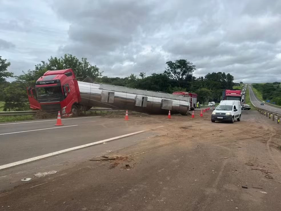 Uma carreta que transportava óleo vegetal tombou na rodovia SP-225 e causou interdição total da via, na manhã desta segunda-feira (3), em Piratininga (SP). As informações são do g1.