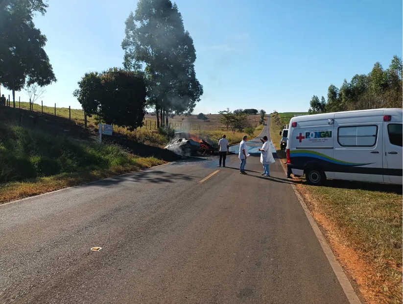 Um carro e um caminhão pegaram fogo e ficaram destruídos após um acidente na Estrada Vicinal Moacir de Oliveira Camponez do Brasil, em Pongaí (SP), 190 quilômetros de Ourinhos (SP), na tarde desta segunda-feira (3).