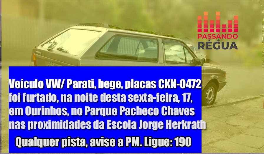 O carro da marca VW/Parati, bege, com placas CKN-0472, de Ourinhos, foi furtado de frente da casa de um serralheiro de 42 anos, na Rua Diogo Robles de Godoy, 216, no Parque Pacheco Chaves. Neste domingo o serralheiro recebeu a ligação de um homem dizendo que teria comprado a Parati em Santo Antônio da Platina, por R$1.500,00. Por volta das 15h30, o carro foi recuperado.