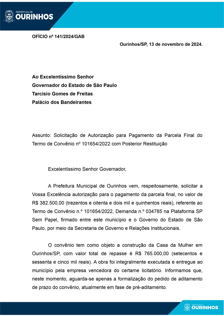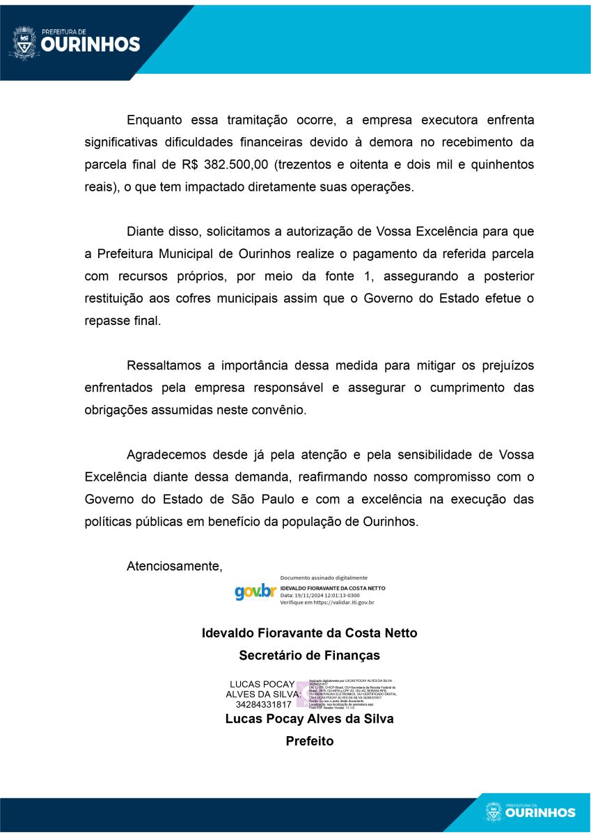 Nesta semana, o prefeito de Ourinhos, Lucas Pocay, e o secretário de Finanças, Idevaldo da Costa Netto, enviaram um ofício ao governador Tarcísio de Freitas solicitando autorização para a liberação do pagamento pendente.