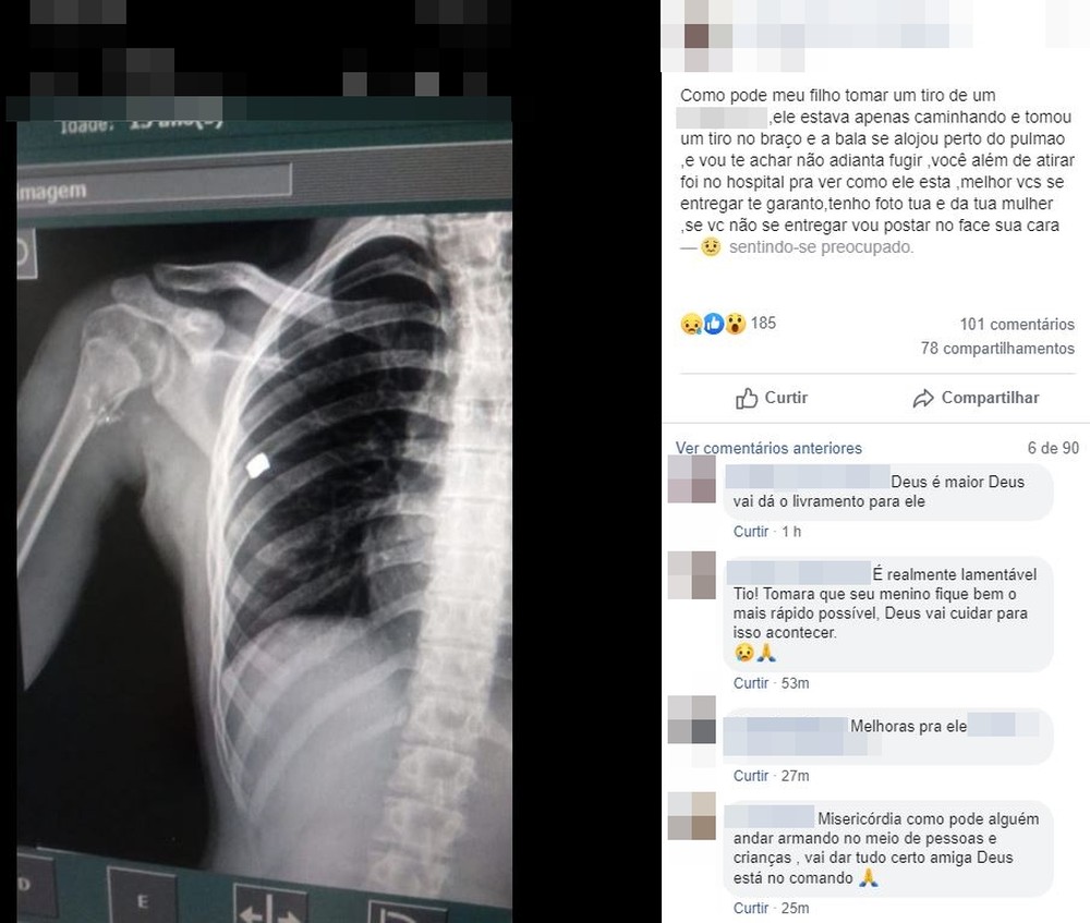 "Ele estava apenas caminhando e tomou um tiro no braço, e a bala se alojou perto do pulmão. Vou te achar, não adianta fugir", diz o homem em um trecho da publicação. Nos comentários, amigos lamentaram o ocorrido.