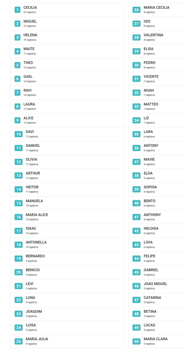 No ranking local, Cecília liderou as escolhas, com 22 registros, seguida de perto por Miguel, com 21, e Helena, que apareceu em terceiro lugar, com 19 registros. Os três nomes também figuraram no topo das preferências em outras cidades do centro-oeste paulista, evidenciando um padrão semelhante em toda a região.
