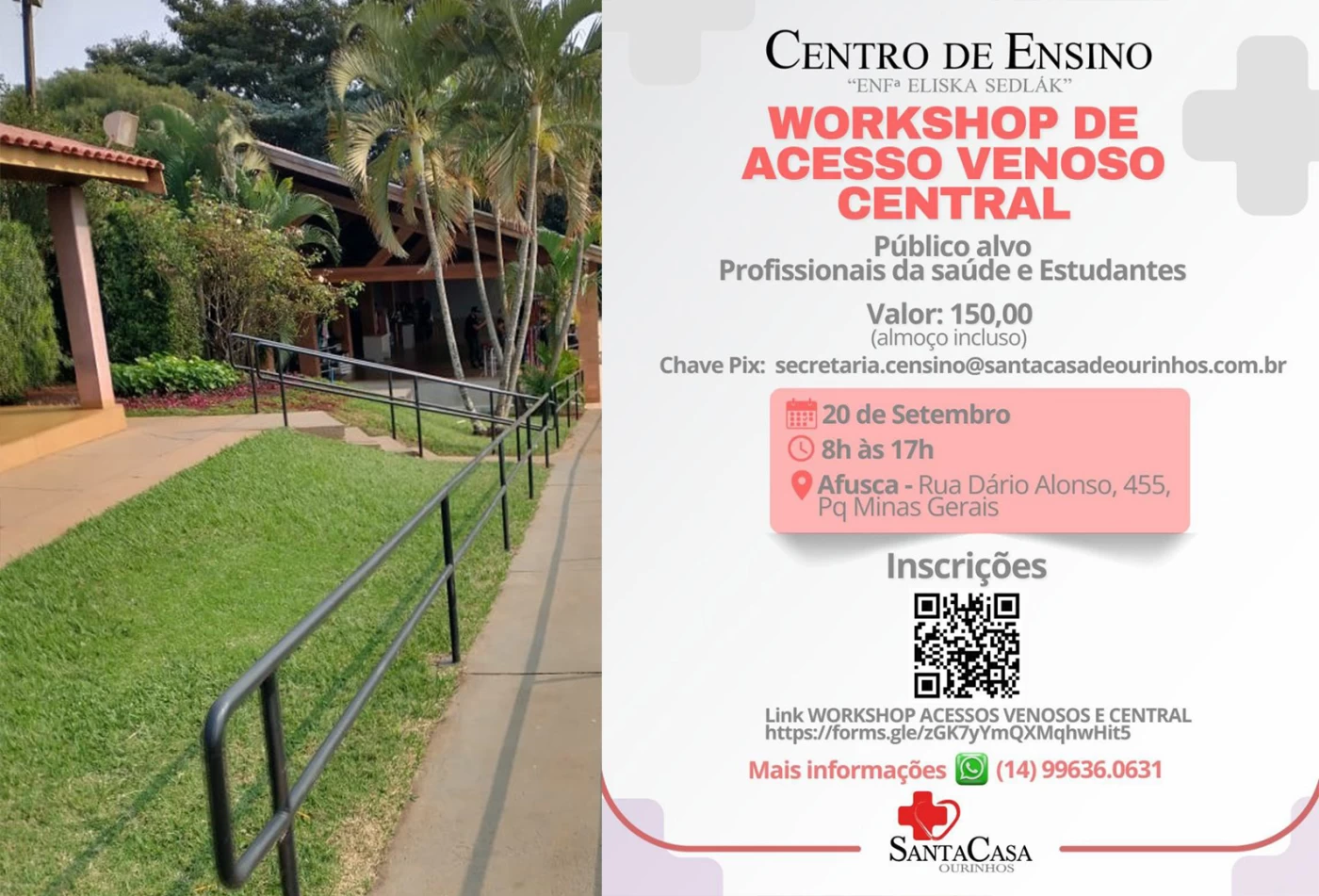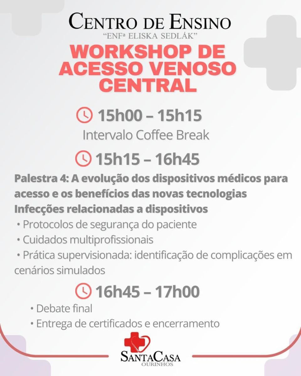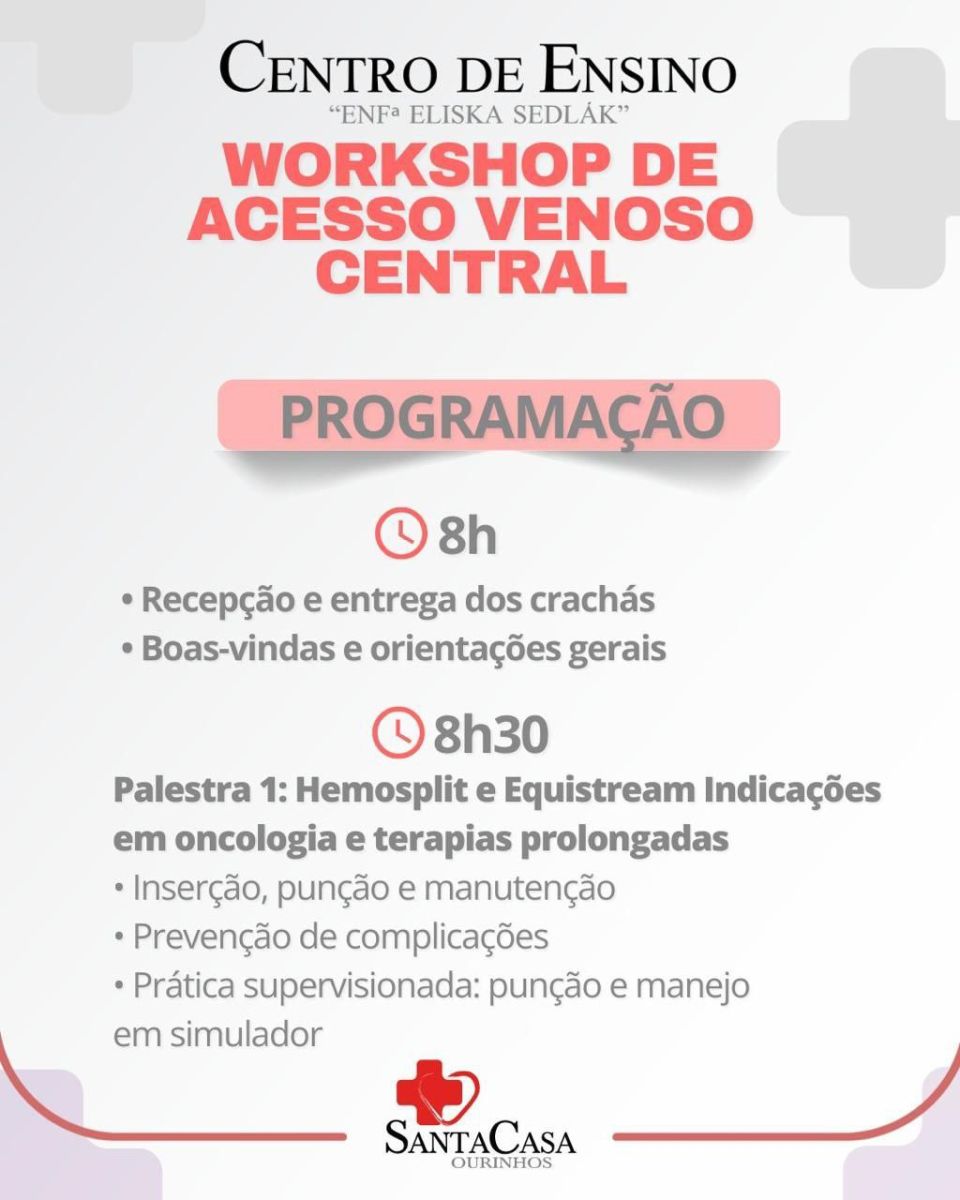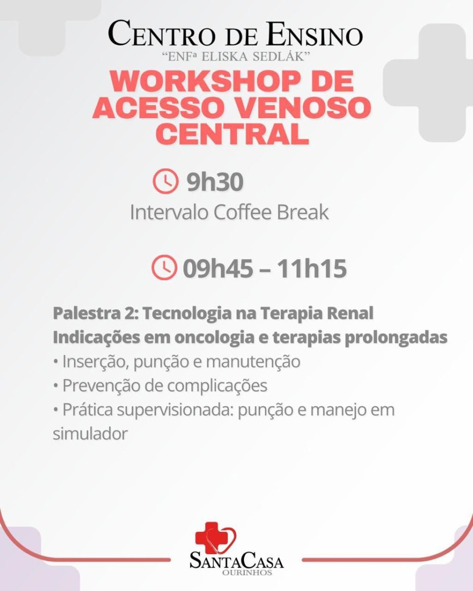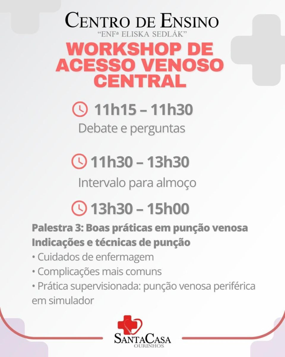 O Centro de Ensino da Santa Casa de Ourinhos realiza no próximo dia 20 de setembro o Workshop de Acesso Venoso Central, um treinamento intensivo voltado a profissionais e estudantes da área da saúde.