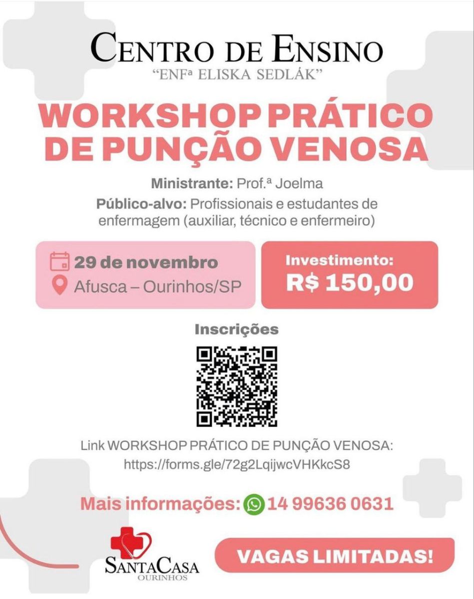 O Centro de Ensino da Santa Casa de Ourinhos está com inscrições abertas para o Workshop Prático de Punção Venosa, que será realizado no dia 29 de novembro, das 8h às 17h, na AFUSCA, em Ourinhos (SP).