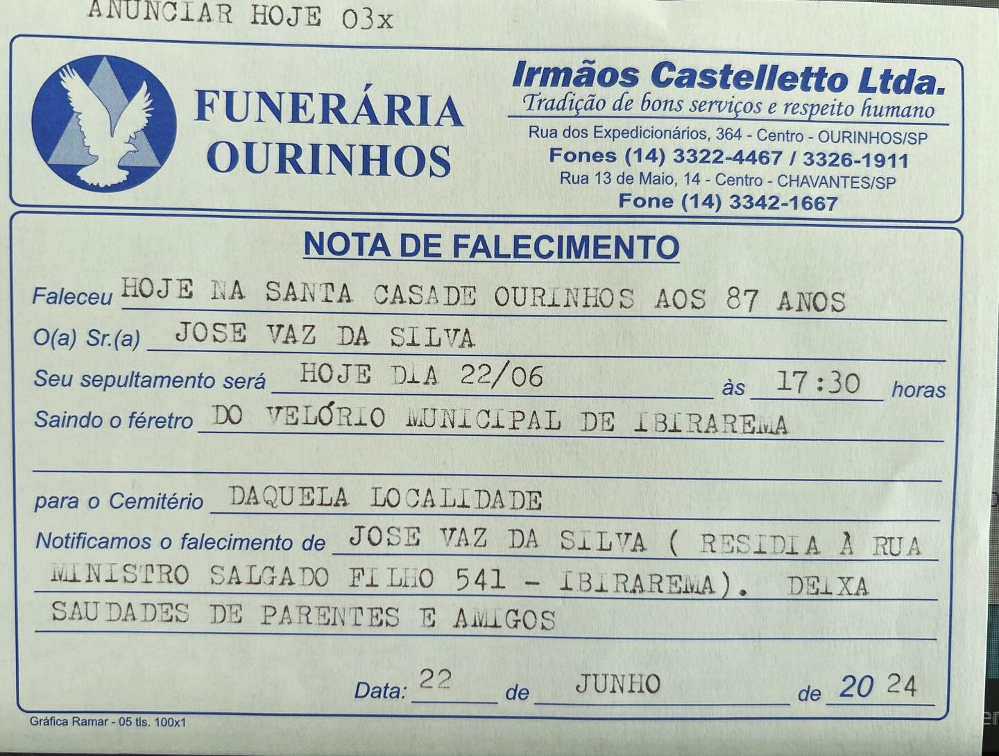 A Funerária Ourinhos informa o falecimento de José Vaz da Silva, aos 87 anos. O velório no Velório Municipal de Ibirarema. O sepultamento ocorrerá hoje, dia 22, às 17h30, no Cemitério Municipal de Ibirarema.