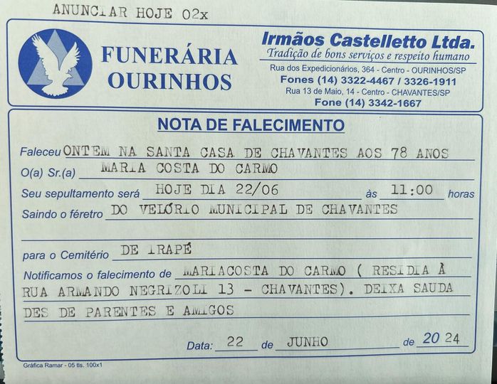 A Funerária Ourinhos informa o falecimento de Maria Costa do Carmo, aos 78 anos. O velório realizado no Velório Municipal de Chavantes. O sepultamento ocorrerá hoje, dia 22, às 11 horas, no Cemitério do Distrito de Irapé, em Chavantes.