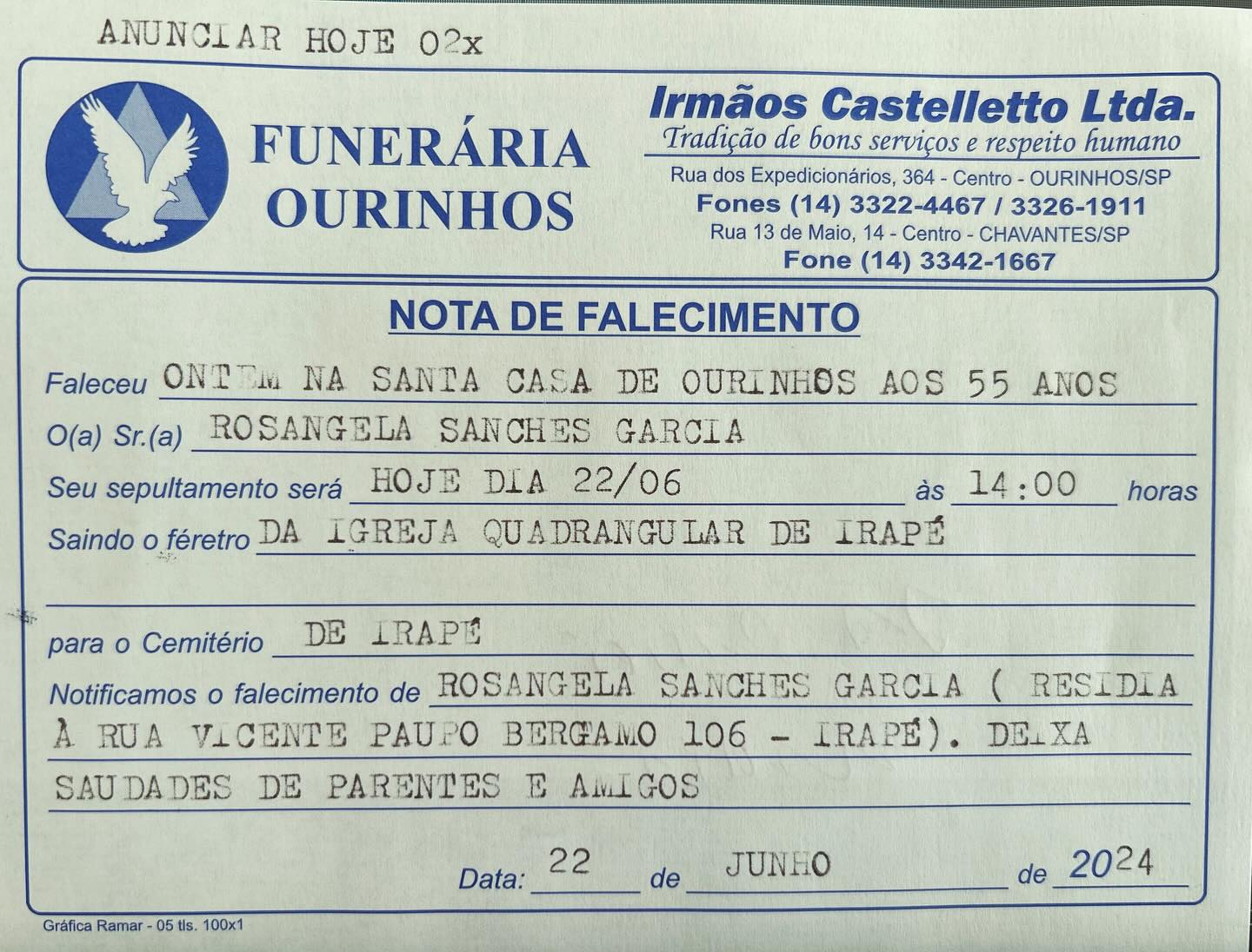 A Funerária Ourinhos informa o falecimento Rosangela Sanches Garcia, aos 55 anos. O velório realizado na Igreja Quadrangular do Distrito de Irapé, em Chavantes. O sepultamento ocorrerá hoje, dia 22, às 14 horas, no Cemitério do Distrito de Irapé, em Chavantes.