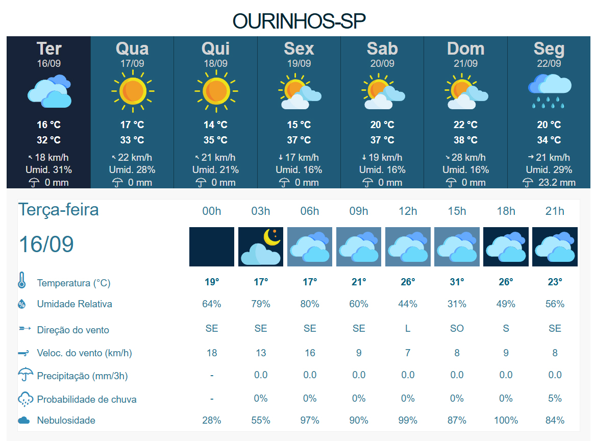 A terça-feira, 16, começou com surpresa para os moradores de Ourinhos. Apesar de a previsão do IMET Bauru não indicar possibilidade de chuva, a cidade registrou precipitação por volta das 7h da manhã. As temperaturas variam entre mínima de 16ºC e máxima de 32ºC.