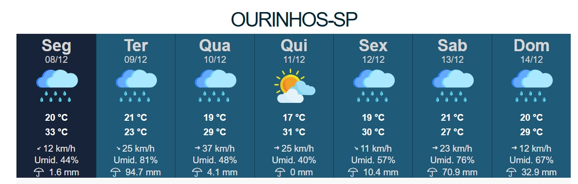 - Terça (09/12): Tempo fechado e chuvoso. Alerta para alto volume de chuva (estimativa de até 94 mm). Mínima de 21°C e Máxima de 24°C.