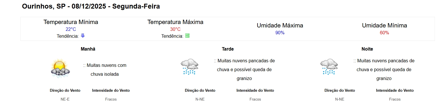 - Segunda (08/12): Dia quente e abafado. Sol entre nuvens com pancadas de chuva à tarde e à noite. Risco de granizo. Mínima de 22°C e Máxima de 33°C.