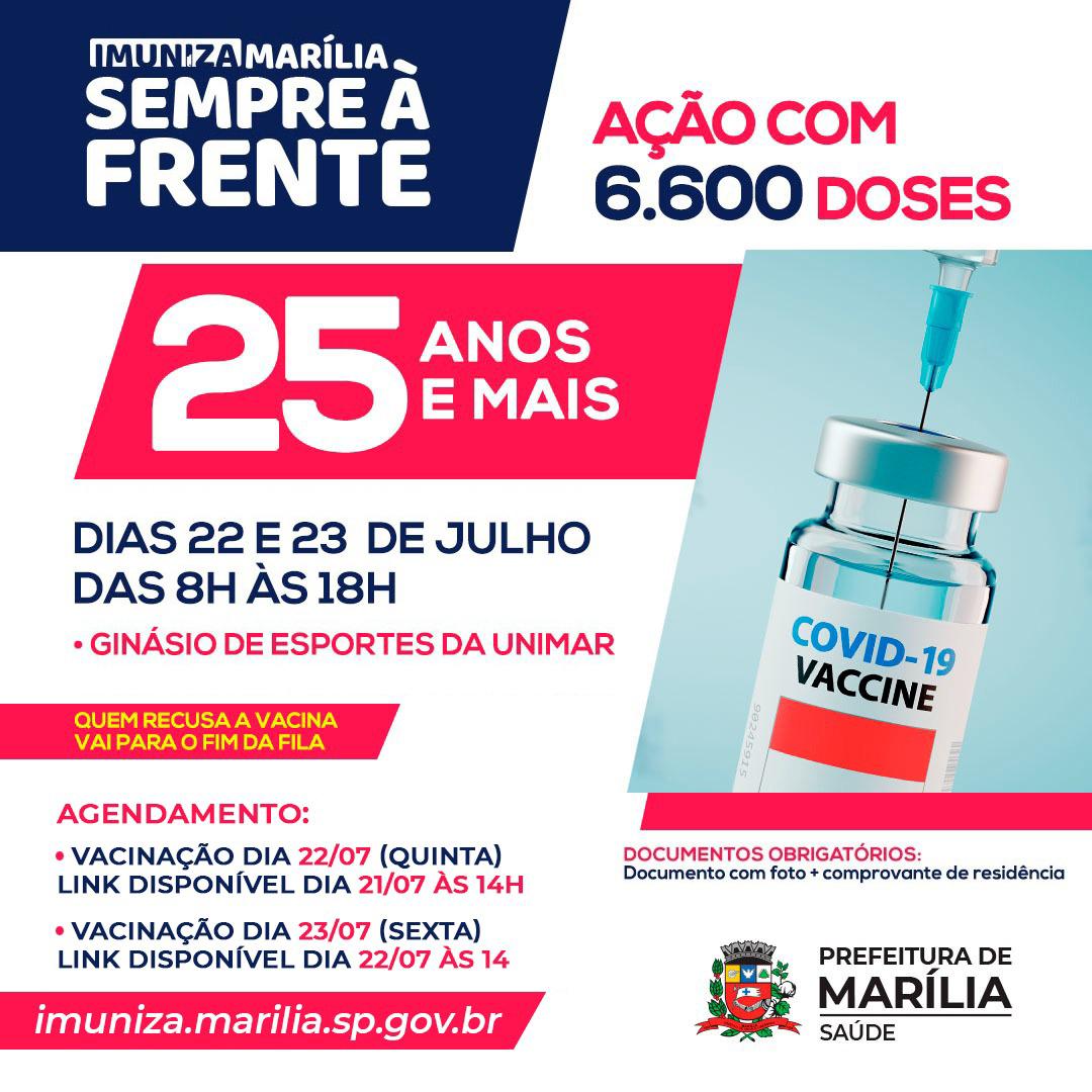 A Prefeitura de Marília (SP) (90 km de Ourinhos) anunciou na tarde desta terça-feira, 20, mais uma antecipação de calendário da vacinação contra a Covid-19 com a aplicação das doses para pessoas com idade a partir de 25 anos.