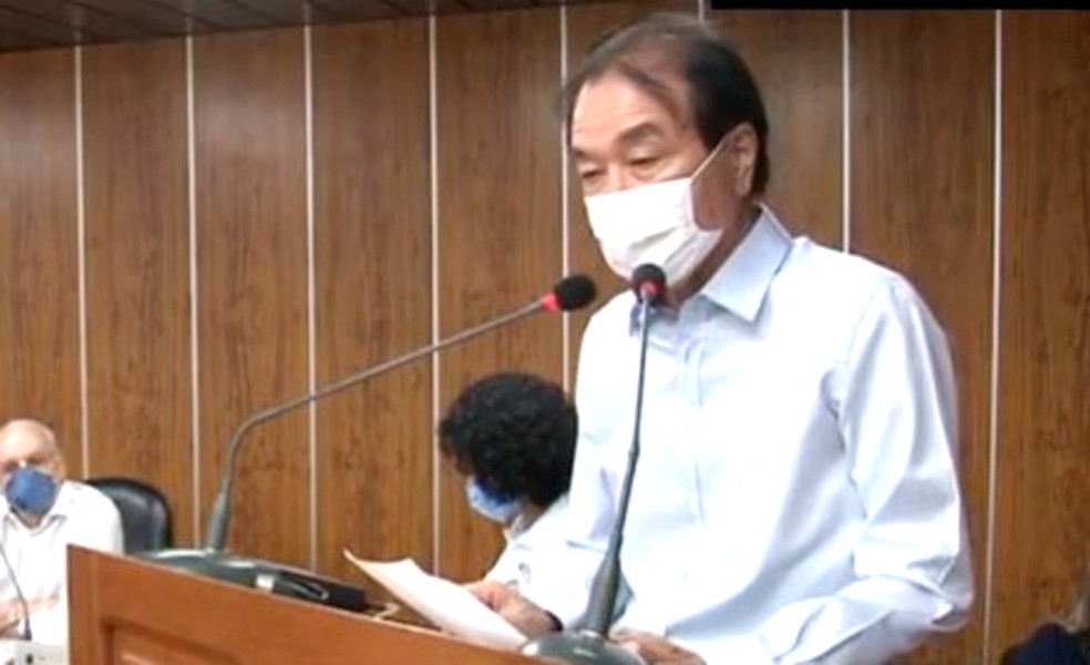 Akio Matsuura (PSDB) discursa na Tribuna da Câmara momentos antes da votação feita pelos vereadores — Foto: Reprodução/TV Câmara de Lins