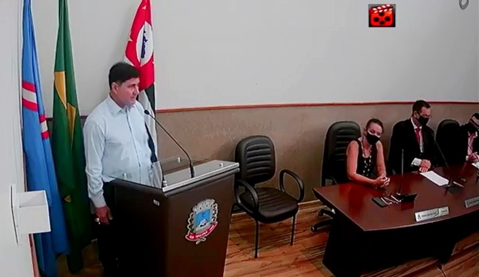 Paulo Haraguchi (DEM), novo prefeito de Vera Cruz, retirou a máscara para fazer seu discurso — Foto: Reprodução/TV Câmara de Vera Cruz