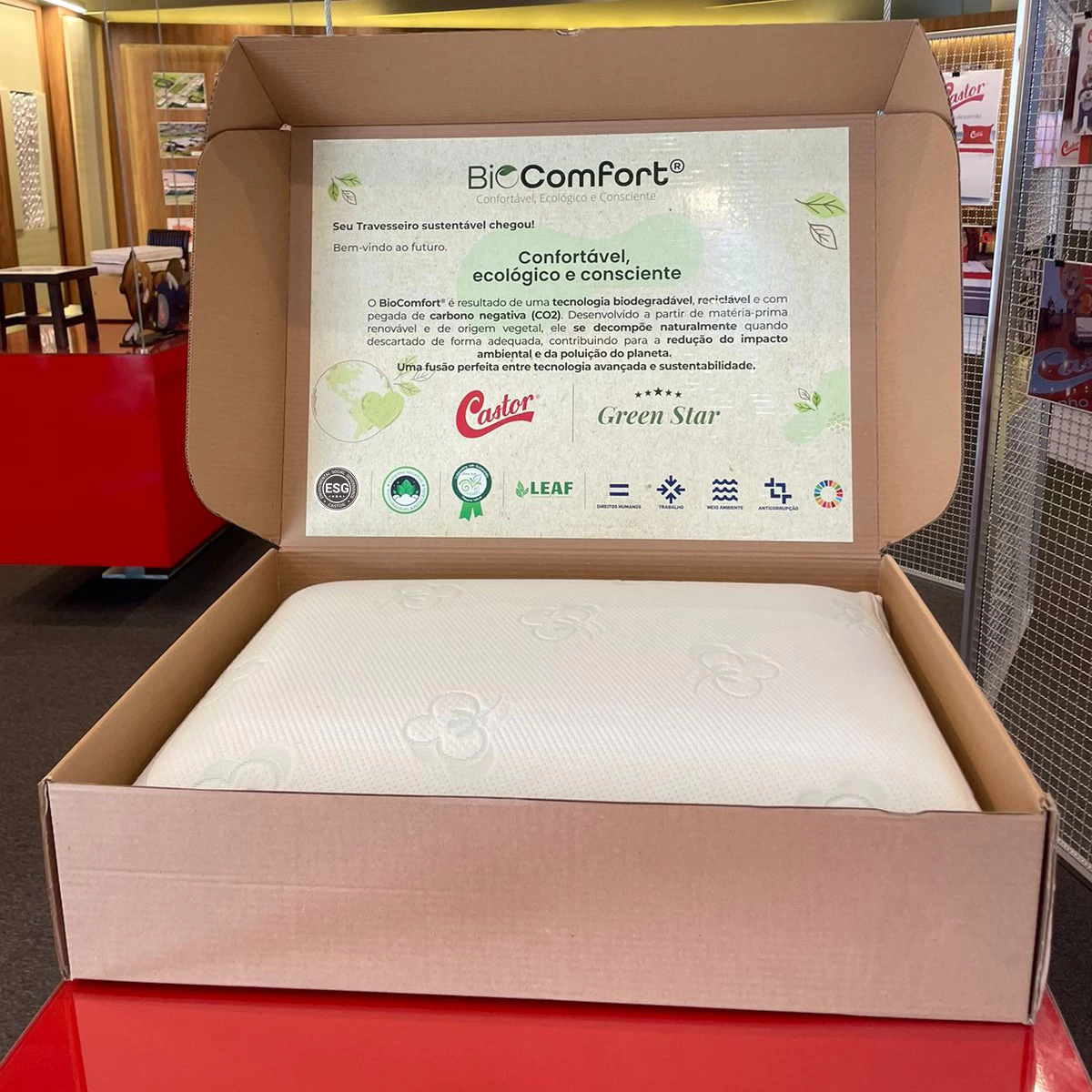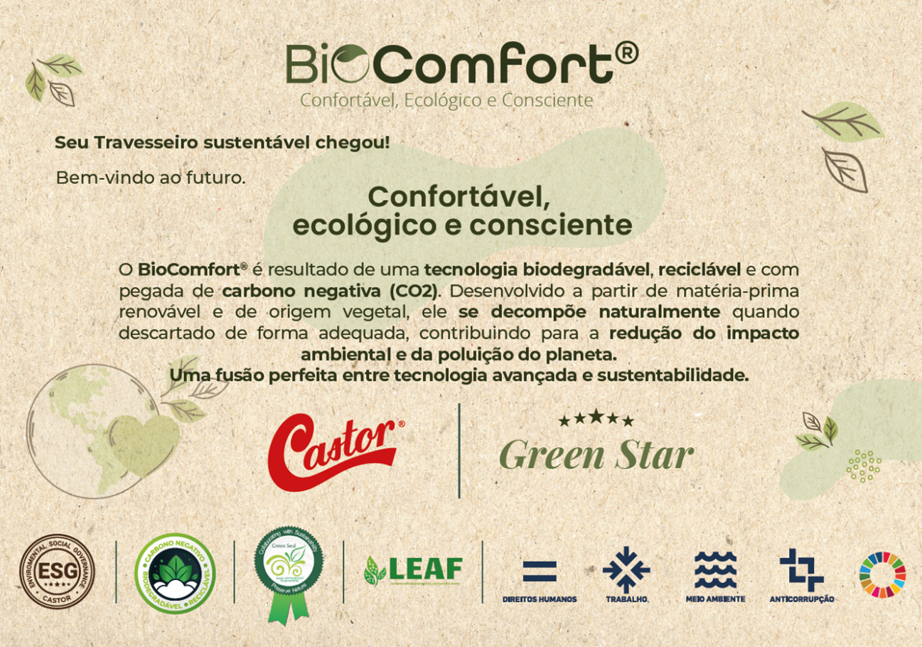 Além do uso da tecnologia Biovisco™ da LEAF, a capa do travesseiro BioComfort® é feita de tecido orgânico, reforçando o compromisso da Castor com a sustentabilidade. O produto é 100% reciclável, promovendo um ciclo de vida mais sustentável. A pegada de carbono do travesseiro BioComfort® é de 1,70 Kg CO2 Eq/Kg, em comparação com os 5,0 Kg CO2 Eq/Kg de um travesseiro convencional.