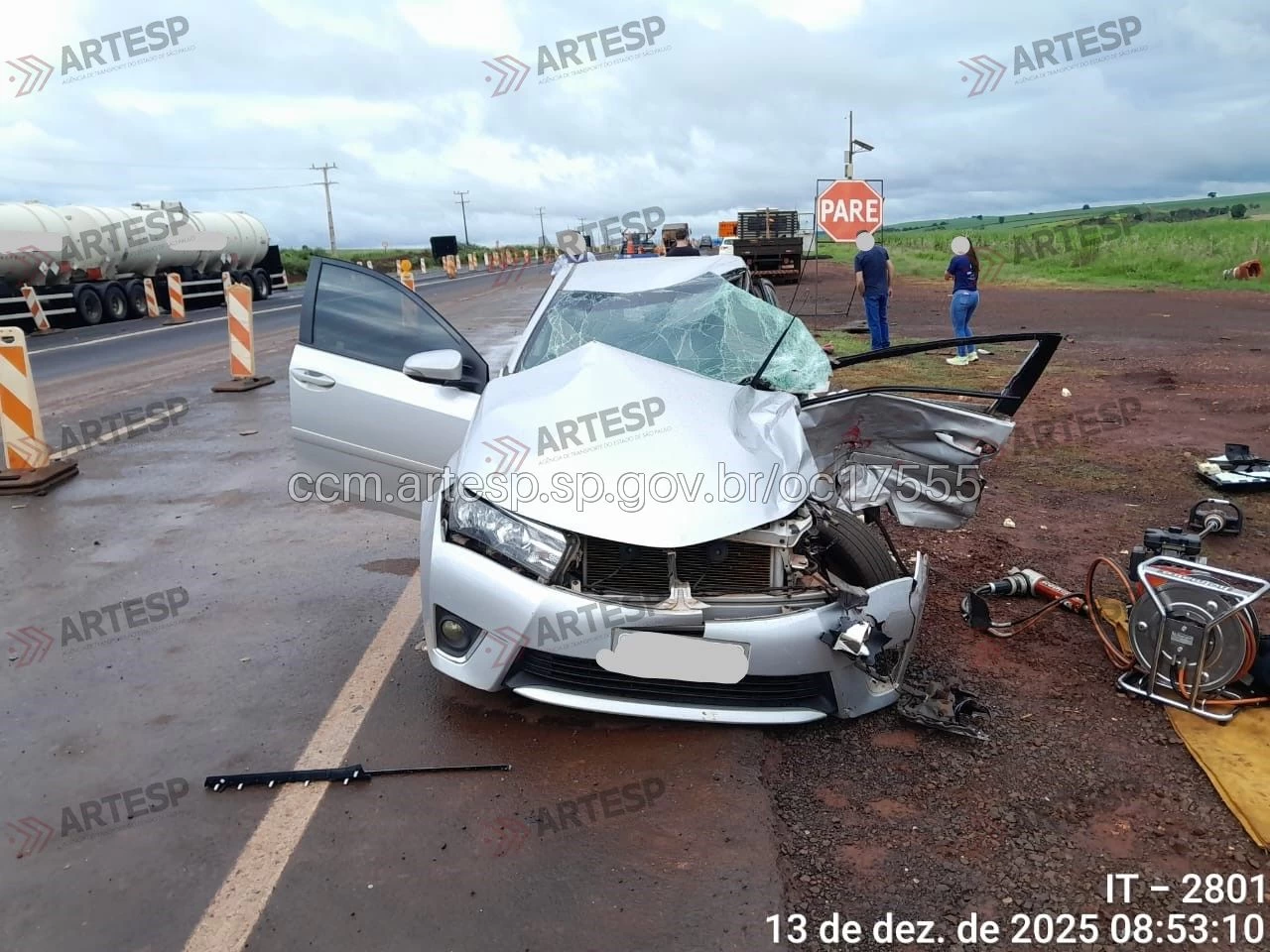 De acordo com dados apurados no atendimento da ocorrência, o Toyota Corolla seguia no sentido leste da rodovia e, ao atingir o km 494, por motivos ainda não esclarecidos e sem tempo hábil para frear ou desviar, acabou colidindo transversalmente contra o caminhão. Após a batida, os veículos ficaram imobilizados na alça de entrada da pista. Não houve envolvimento de carga no acidente.