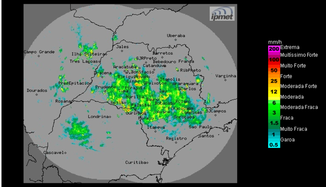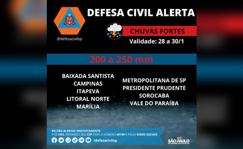 Também há previsão de chuva forte nas regiões de Itapeva, Sorocaba e Marília, que devem registrar de 200 a 250 milímetros de chuva até domingo (30).