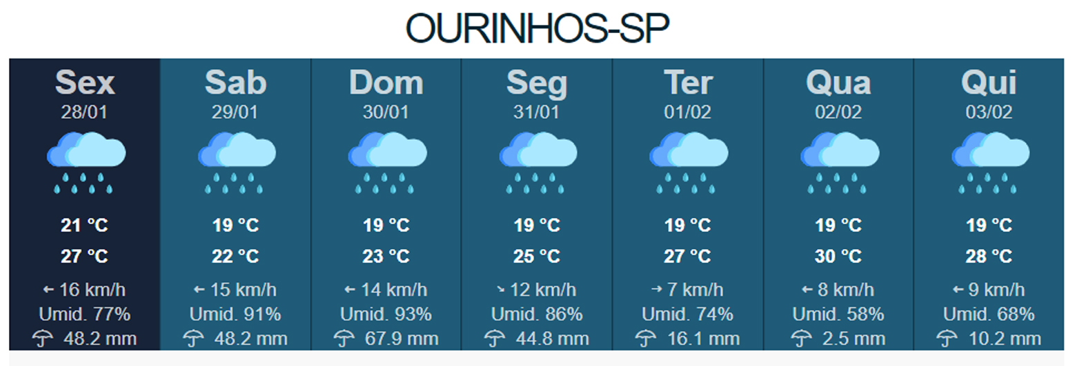 A Defesa Civil de São Paulo emitiu um alerta sobre chuvas fortes a partir desta sexta-feira, 28, em várias regiões do estado. De acordo com o órgão, há previsão de chuvas, seguidas por raios e ventos, até domingo, 30. Confira como está a situação do tempo em Ourinhos.