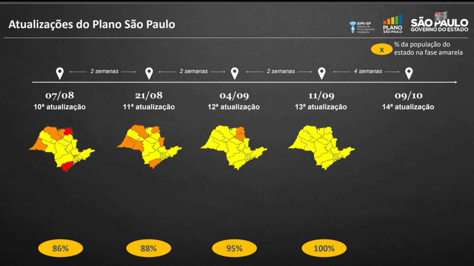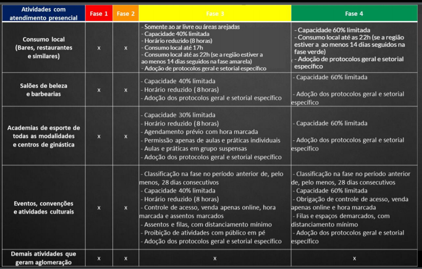 O Governador João Doria anunciou nesta sexta-feira (11) a atualização do Plano São Paulo de enfrentamento ao coronavírus e retomada econômica com todas as regiões do estado na fase amarela, que permite atendimento presencial em bares, restaurantes, salões de beleza, academias, shoppings, comércios de rua, escritórios em geral e concessionárias. A reclassificação para progressões de fase passa a ser mensal, com nova revisão no dia 9 de outubro.