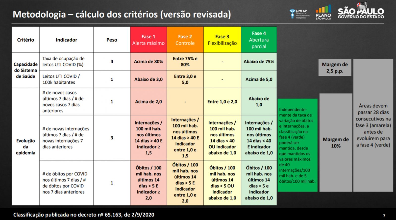 Com a estabilidade do avanço da pandemia em todas as regiões do estado, o Centro de Contingência do coronavírus recomendou que o monitoramento seja estendido para um período mínimo de 28 dias. O acompanhamento dos indicadores nas próximas quatro semanas vai garantir mais segurança na possível migração de regiões para a fase verde a partir do início de outubro.