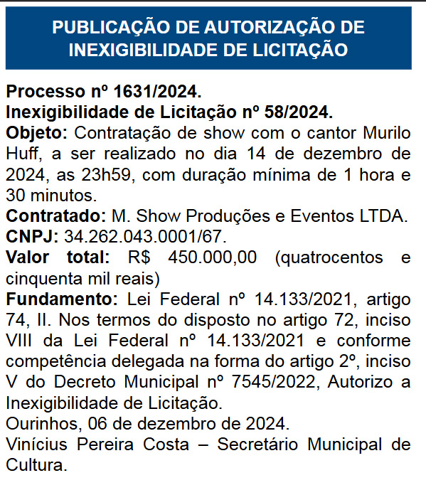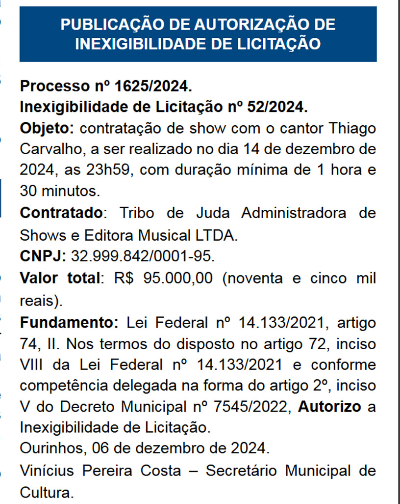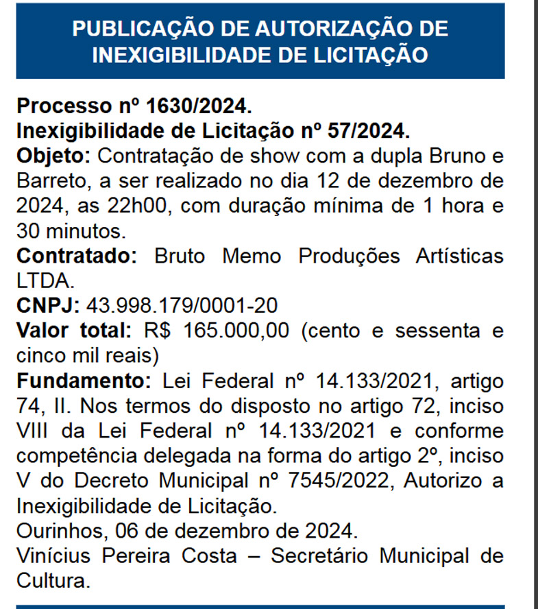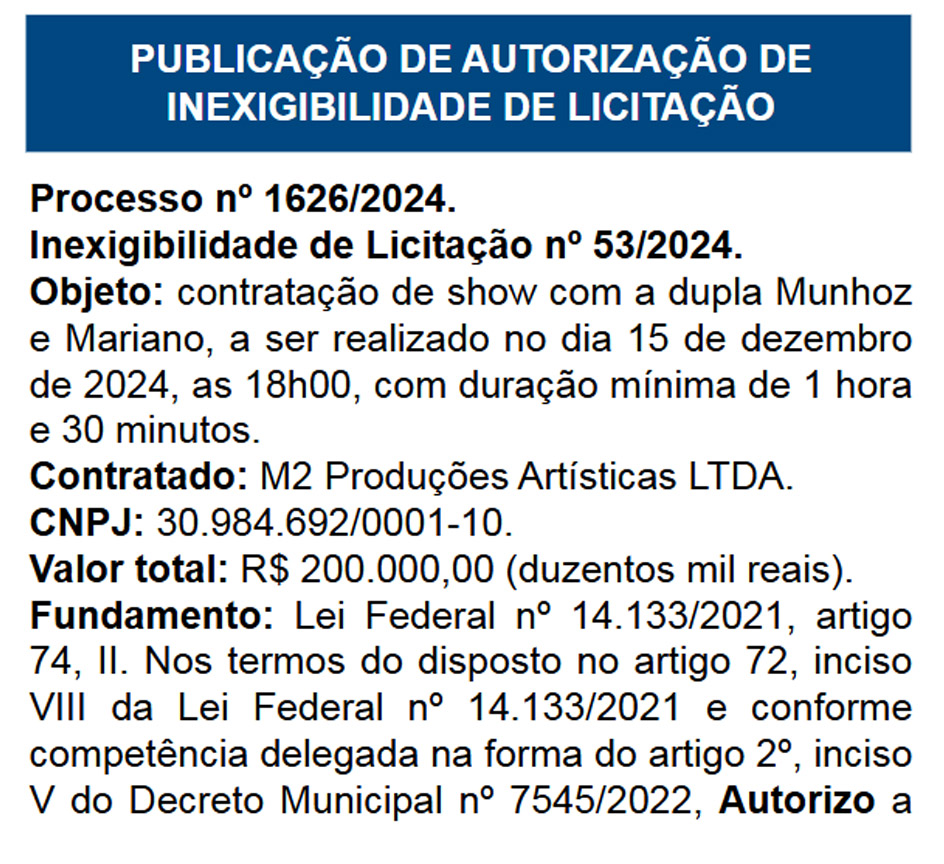Os shows foram contratados por inexigibilidade de licitação e terão duração mínima de 1h30 cada. Todos os contratos especificam os horários das apresentações e os valores pagos aos artistas. A programação completa está descrita abaixo: