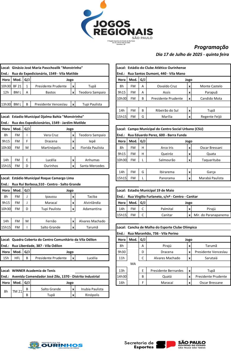 Com organização conjunta entre a Prefeitura de Ourinhos, o Governo do Estado de São Paulo e a Diretoria Regional de Esportes, os Jogos Regionais não apenas revelam talentos, mas fortalecem o espírito esportivo, a cidadania e a união entre os municípios.