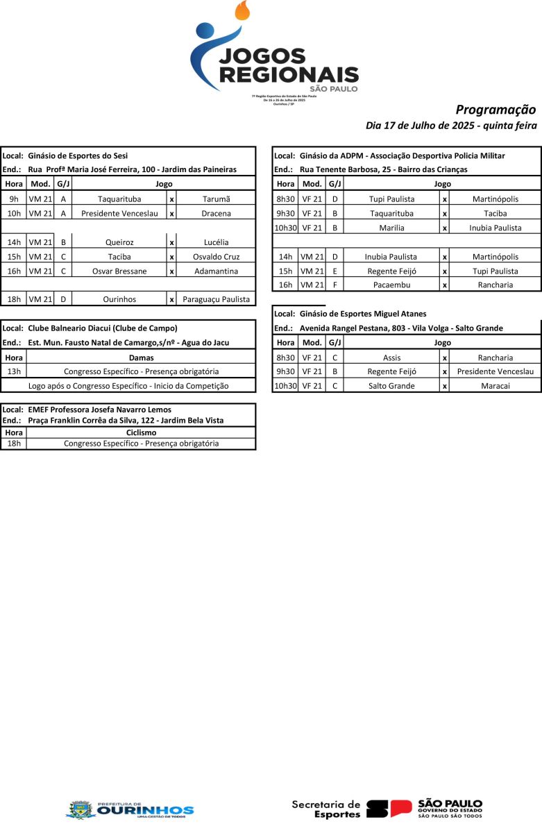 De 16 a 26 de julho, Ourinhos será o centro das atenções esportivas do Estado ao sediar a 67ª edição dos Jogos Regionais da 7ª Região Esportiva de São Paulo. O evento, um dos mais tradicionais do calendário esportivo paulista, reunirá cerca de 6 mil pessoas, entre atletas, técnicos, árbitros e organizadores, representando 64 municípios, o maior número de participantes entre todas as regiões esportivas do Estado.