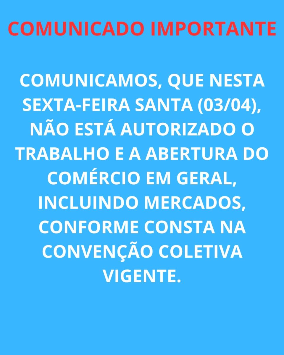De acordo com a entidade, não está autorizada a abertura de estabelecimentos comerciais em geral, incluindo supermercados. A orientação segue o que determina a Convenção Coletiva de Trabalho vigente, que prevê a suspensão das atividades comerciais na data.