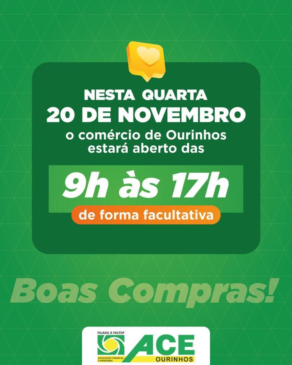 O comércio de Ourinhos estará aberto de forma facultativa nesta quarta-feira, 20 de novembro. Mesmo com o feriado, as lojas que optarem por abrir atenderão o público das 9 às 17 horas – uma grande oportunidade para aproveitar as promoções da Black November.