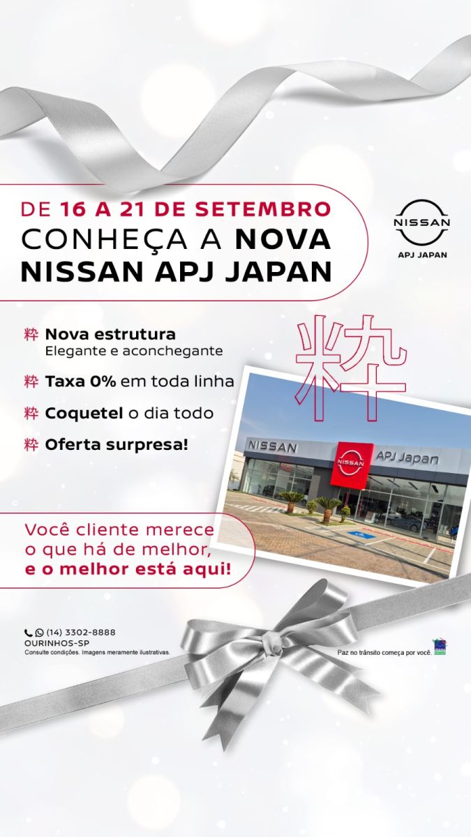A concessionária APJ Japan Nissan, localizada na Avenida Luiz Saldanha Rodrigues, 2675, no bairro Nova Ourinhos, passou por uma grande reforma e está convidando toda a cidade e região para conhecer sua nova estrutura, que foi completamente "repaginada". A partir do dia 16 até o dia 21 de setembro, a "Nova Nissan APJ Japan" oferecerá uma promoção especial para marcar esta nova fase: toda a linha de veículos estará com taxa de financiamento zero.