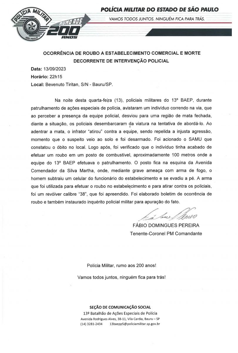 Na noite da última quarta-feira, 13, um homem veio a óbito após um confronto com a Polícia Militar em Bauru (SP), 133 quilômetros de Ourinhos. O incidente ocorreu quando uma equipe de patrulha da PM avistou o indivíduo em fuga na Avenida Benevenuto Tiritam.