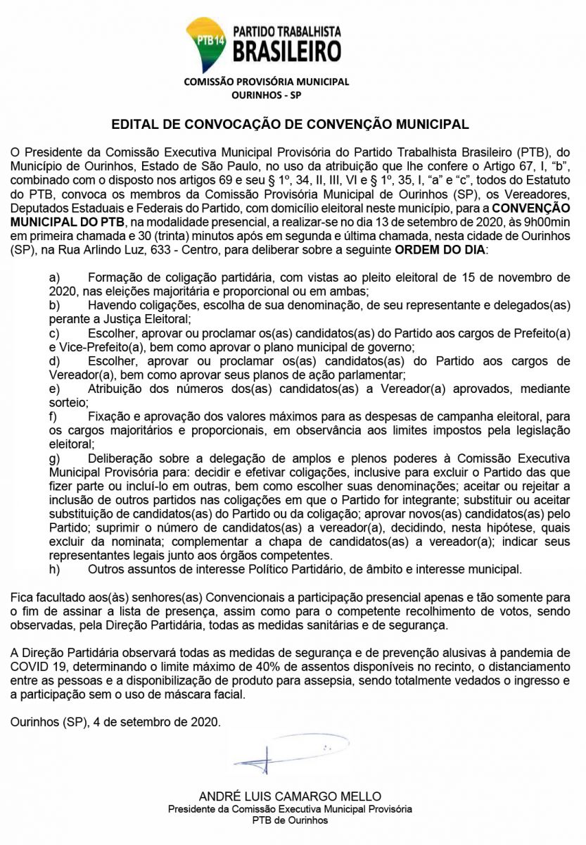 O PTB (Partido Trabalhista Brasileiro), que antes fazia parte do grupo de oposição, resolveu lançar candidatura própria e o empresário Fernando Cavezale (PTB) será candidato, porém ainda não ficou definido quem será o seu vice. O nome deve ser anunciado, na convenção, que acontecerá no escritório de advocacia do presidente do partido, o advogado André Mello, na Rua Arlindo Luz, 633, no Centro. Até 10 vereadores deverão ser lançados no domingo pelo PTB. Confira o edital: