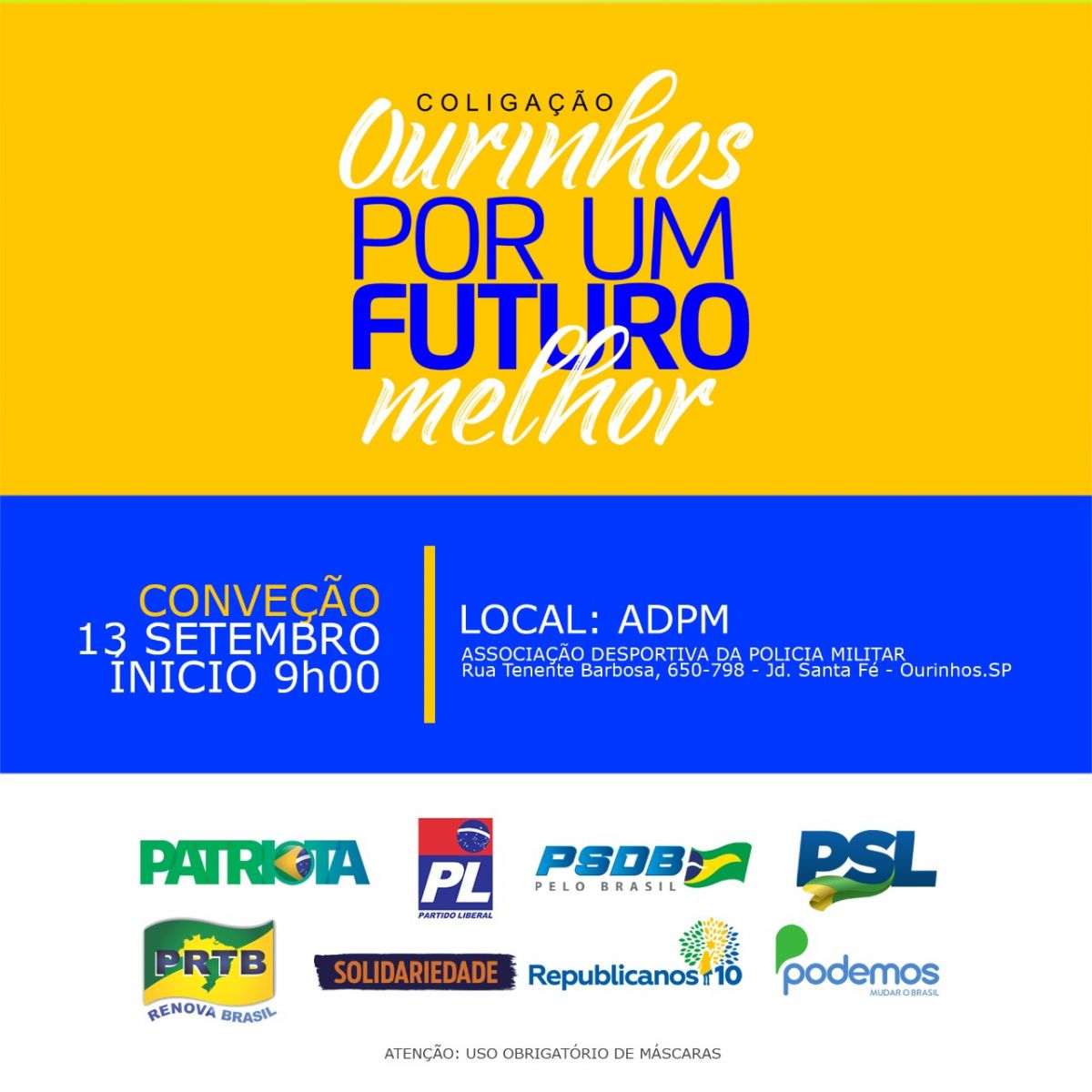 Na ADPM (Associação Desportiva da Polícia Militar), no Jardim Santa Fé, às 9h da manhã estão reunidos os oito partidos do grupo de oposição, denominado “Ourinhos por um futuro melhor”: Patriota, PL, PSDB, PSL, PRTB, Solidariedade, Republicanos e Podemos, que deverão apoiar a candidatura a prefeito de Ourinhos, do professor Robson Sanches (Patriota) e Dr. Salim Mattar (PSDB), como vice. Ao todo o grupo lançará 105 candidatos a vereador.