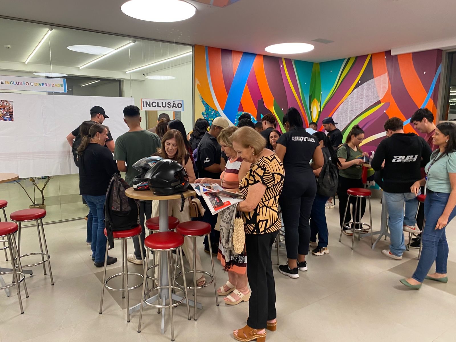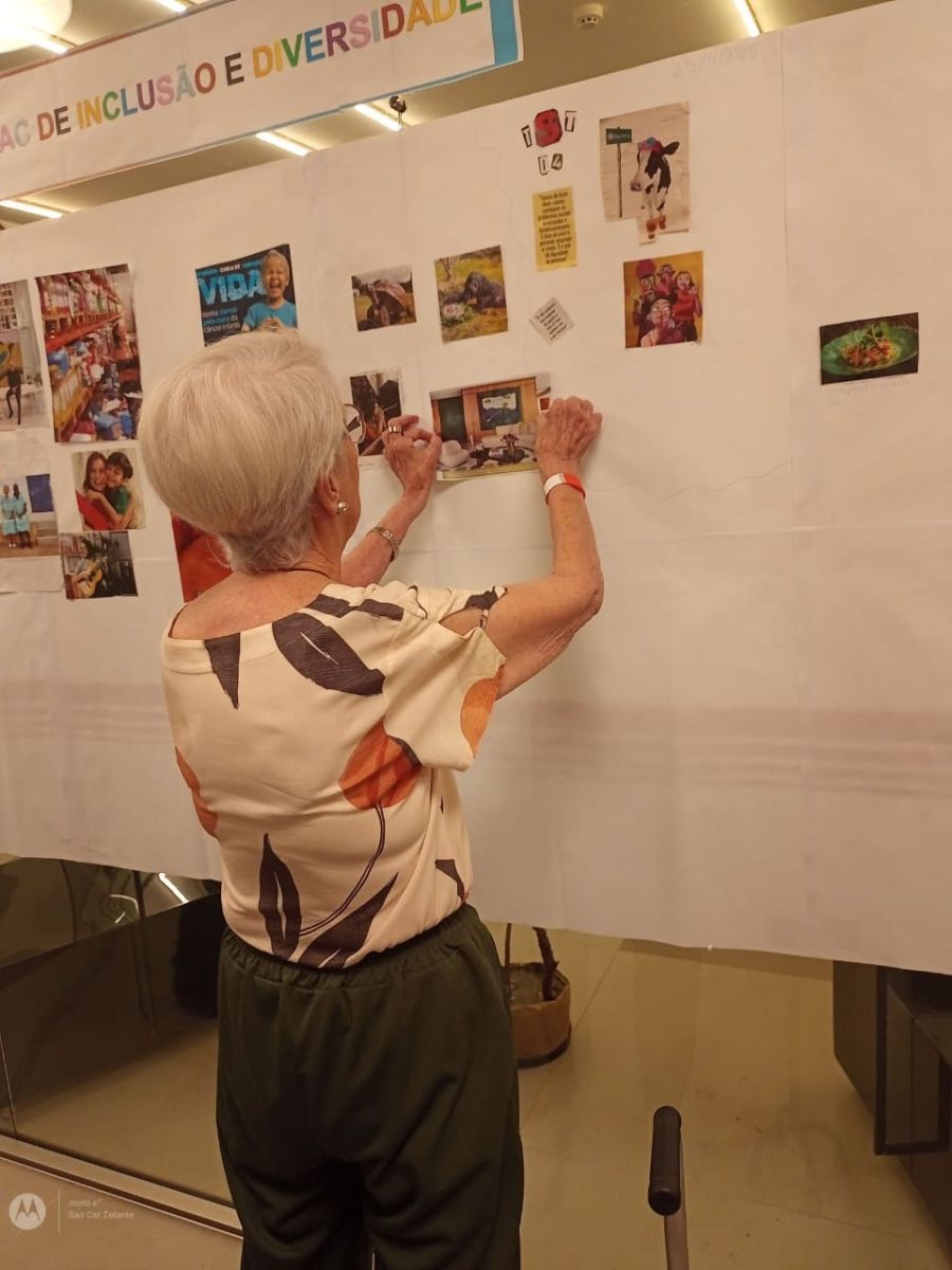 Após a palestra, o público teve a oportunidade de visitar uma exposição com monóculos e participar da construção de um Lambe coletivo linkando com os temas longevidade e pessoa com deficiência.