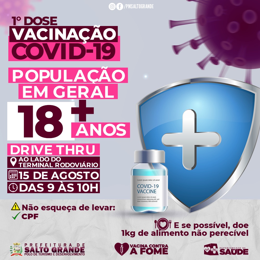O Departamento de Saúde de Salto Grande (19 km de Ourinhos), imuniza com a primeira dose contra a Covid-19 neste domingo, 15, pessoas com idade de 18 anos e as que ainda não tomaram a 1º dose do imunizante.