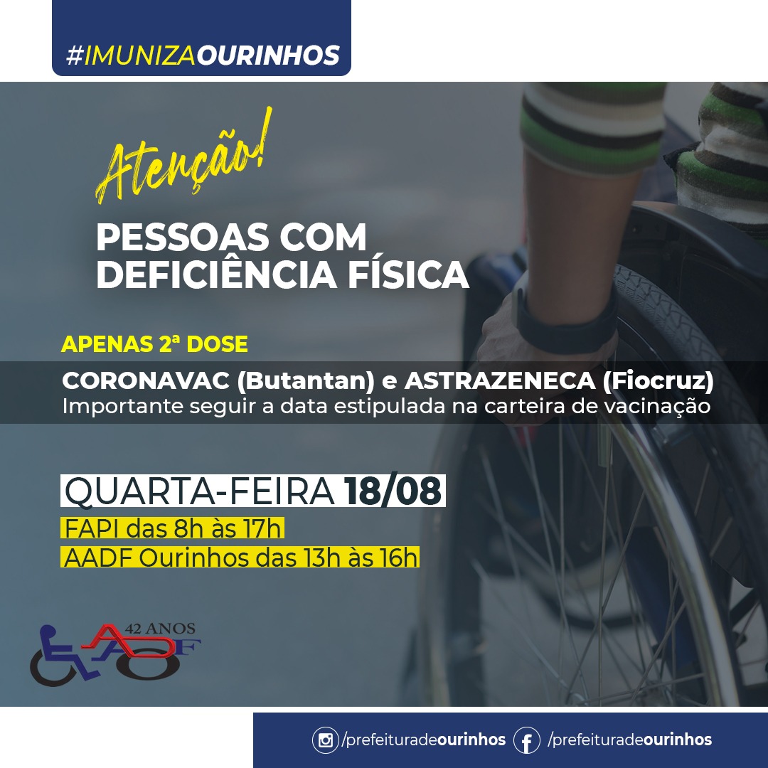 Somente portadores de deficiência, que estão recebendo a 2ª dose, podem se vacinar das 8h às 17 na Fapi, ou das 13h às 16h na AADF. Conforme os banners abaixo: