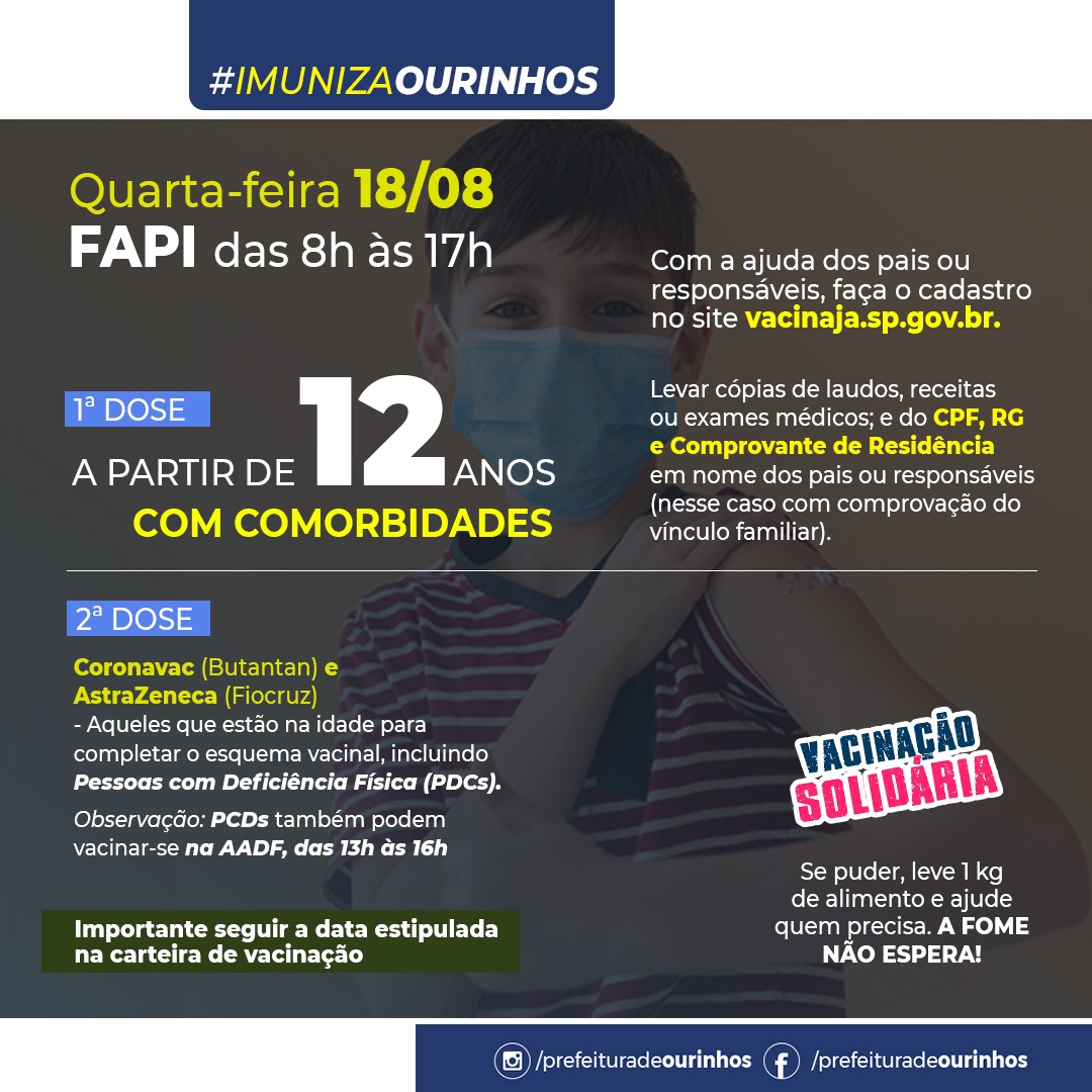 A Prefeitura de Ourinhos anunciou que mantém a vacinação em adolescentes com comorbidades de 12 a 17 anos, além de manter a aplicação da 2ª dose das vacinas CoronaVac e AstraZeneca, para aqueles que estão na data para receber a dose. A vacinação acontece no recinto da Fapi, das 8h às 17h.