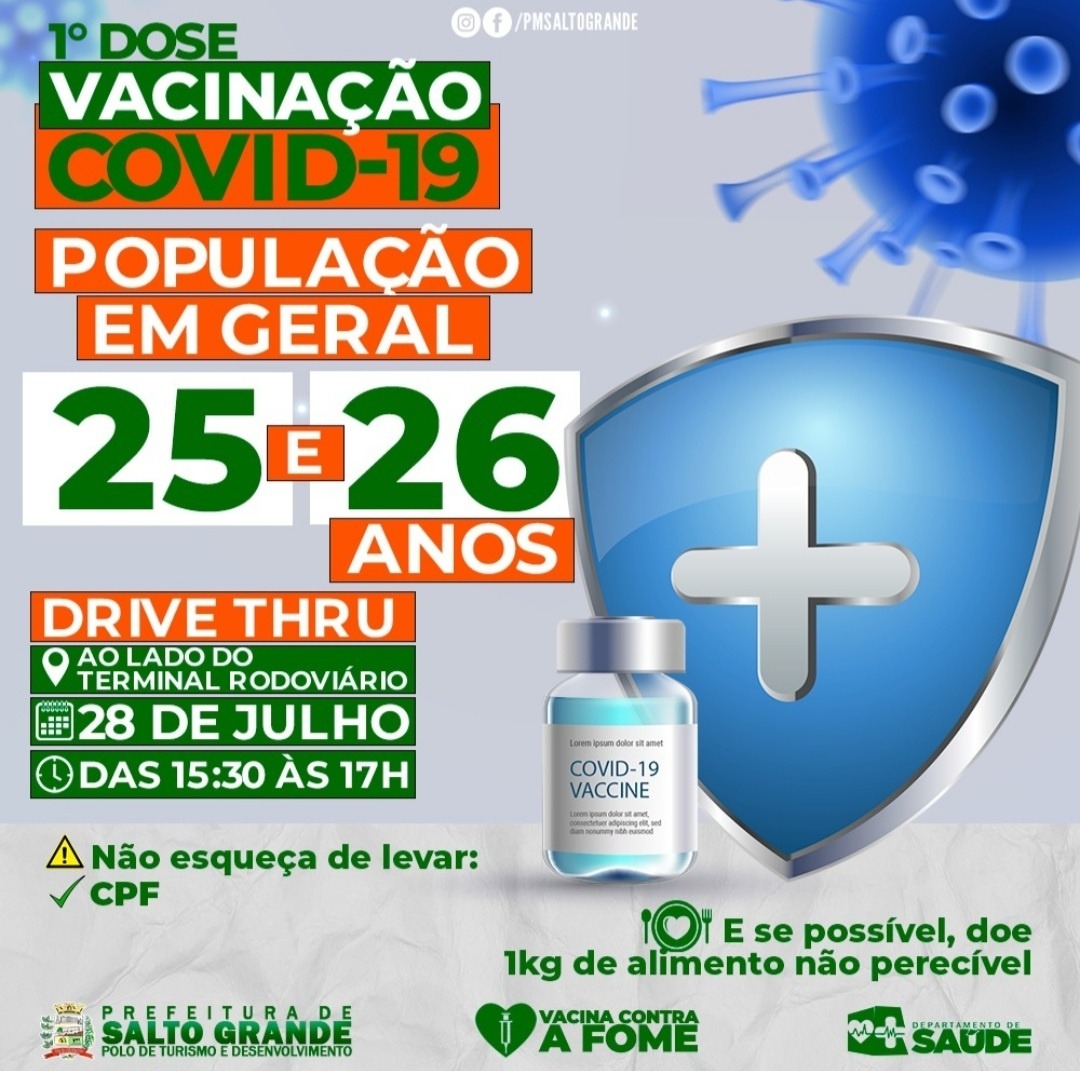 O Departamento de Saúde de Salto Grande (19 km de Ourinhos) informou, nesta terça-feira, 27, que vai imunizar com a primeira dose contra a Covid-19, nesta quarta-feira, 28, pessoas com idades de 25 e 26 anos e as que ainda não tomaram a 1º dose do imunizante.