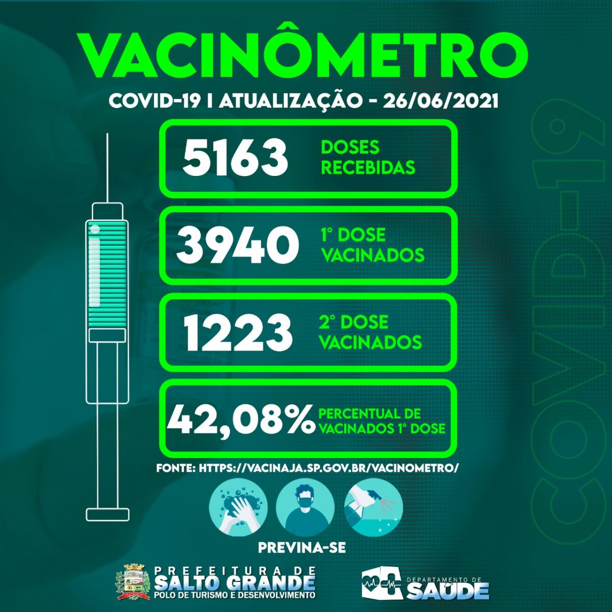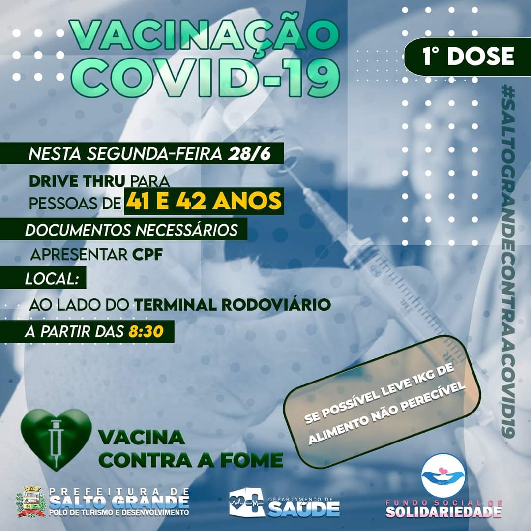A Prefeitura de Salto Grande (19 km de Ourinhos) já inicia a vacinação contra a Covid-19 de pessoas de 41 e 42 anos do público geral, nesta segunda-feira, 28. A vacinação será a partir das 8h30, ao lado do terminal rodoviário. Confira o banner: