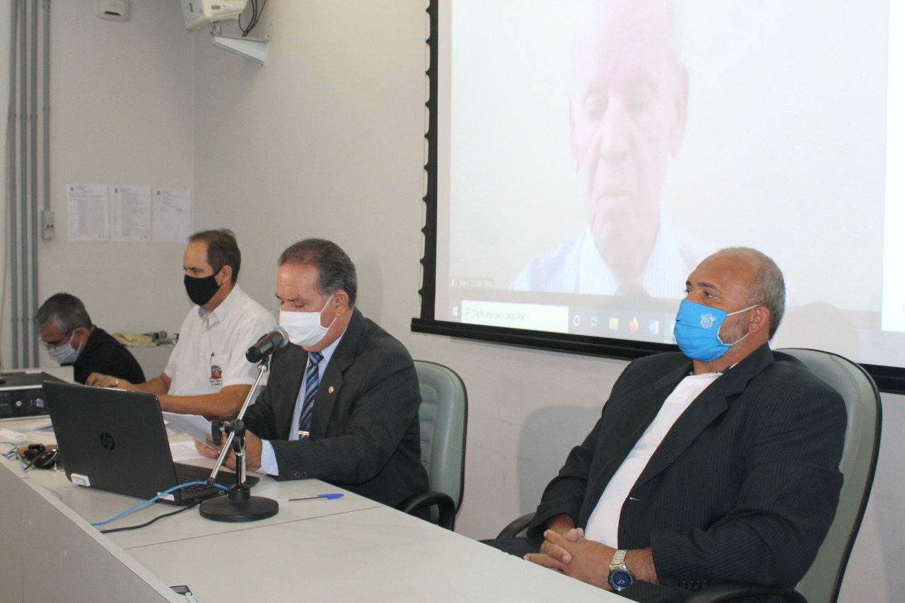 CP ( ao centro Albquerque, a direita João do Bar e no telão Coraini) durante reunião na Câmara Municipal de Marília (Foto: Divulgação)