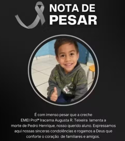 "É com imenso pesar que a EMEI Profª Iracema Augusta R. Teixeira lamenta a morte do nosso querido aluno", diz a nota.