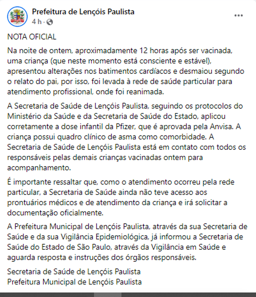 A Prefeitura de Lençóis Paulista (156 km de Ourinhos) emitiu uma nota, na tarde desta quarta-feira, 19, sobre o caso de uma criança que sofreu reações adversas e chegou a desmaiar, após receber a dose da vacina da Pfizer para crianças. De acordo com a Prefeitura a criança está consciente e estável.  “Apresentou alterações nos batimentos cardíacos e desmaiou segundo o relato do pai, por isso, foi levada à rede de saúde particular para atendimento profissional, onde foi reanimada”, destacou a nota (confira a nota na íntegra abaixo).